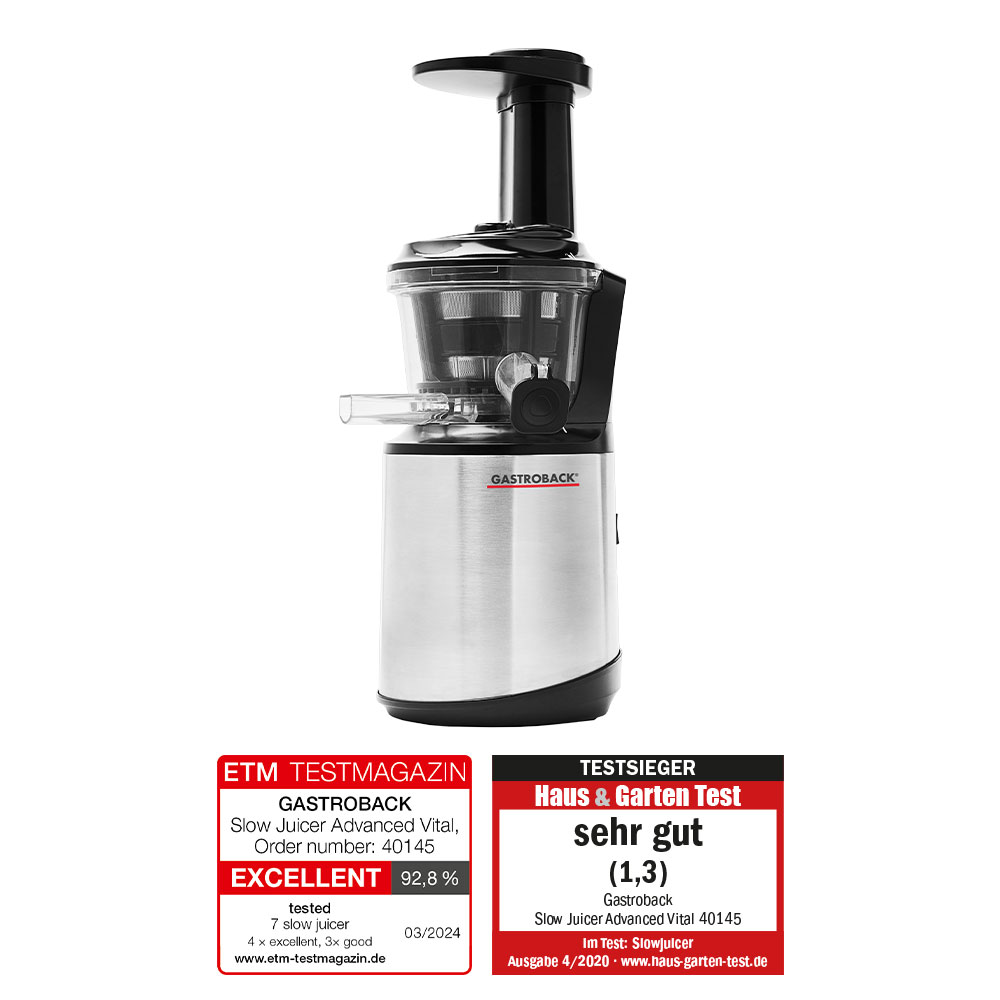 The individual parts can be easily removed for cleaning and are even dishwasher-safe. It is also interesting to note that the Slow Juicer Advanced Vital has a forward and reverse function, a safety cut-out and the housing is made of stainless steel.